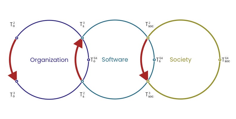 Just to remind you, figure 1 shows the three morphogenetic cycles previously defined. There are three interconnected morphogenetic cycles: organization, software, and society. The cycles illustrate value streaming from the organization into software and society.